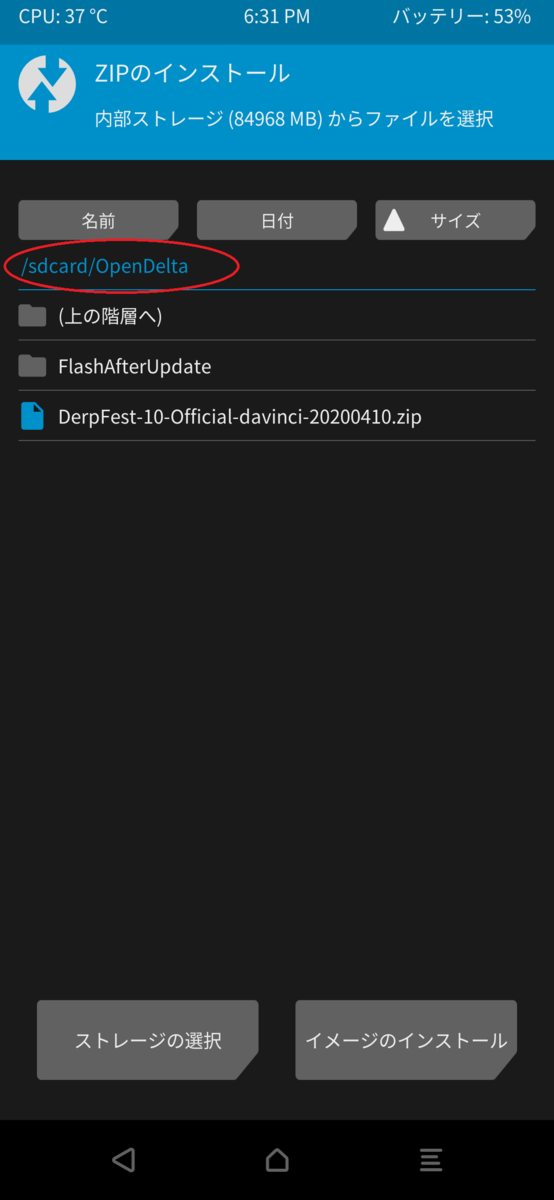 Reboot RecoveryでTWRPが起動。でも、起動しただけでそこからは何も自動で動かなかった。ので、自分でインストールから最新版を選択
